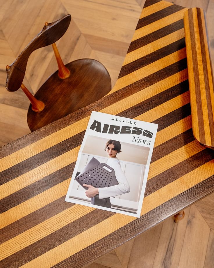 Met de handtas L'Airess eert Delvaux de revolutionaire Avia Airess reiskoffers uit 1946. De soepele lederen buitenkant en het verwijderbare frame met geometrisch gaatjespatroon maakten deze koffers licht en innovatief. Het verhaal werd gepubliceerd in de Delvaux Gazette, oorspronkelijk in het Frans, vertaald naar het Engels en vervolgens door Stille Bliksem hertaald naar het Nederlands.