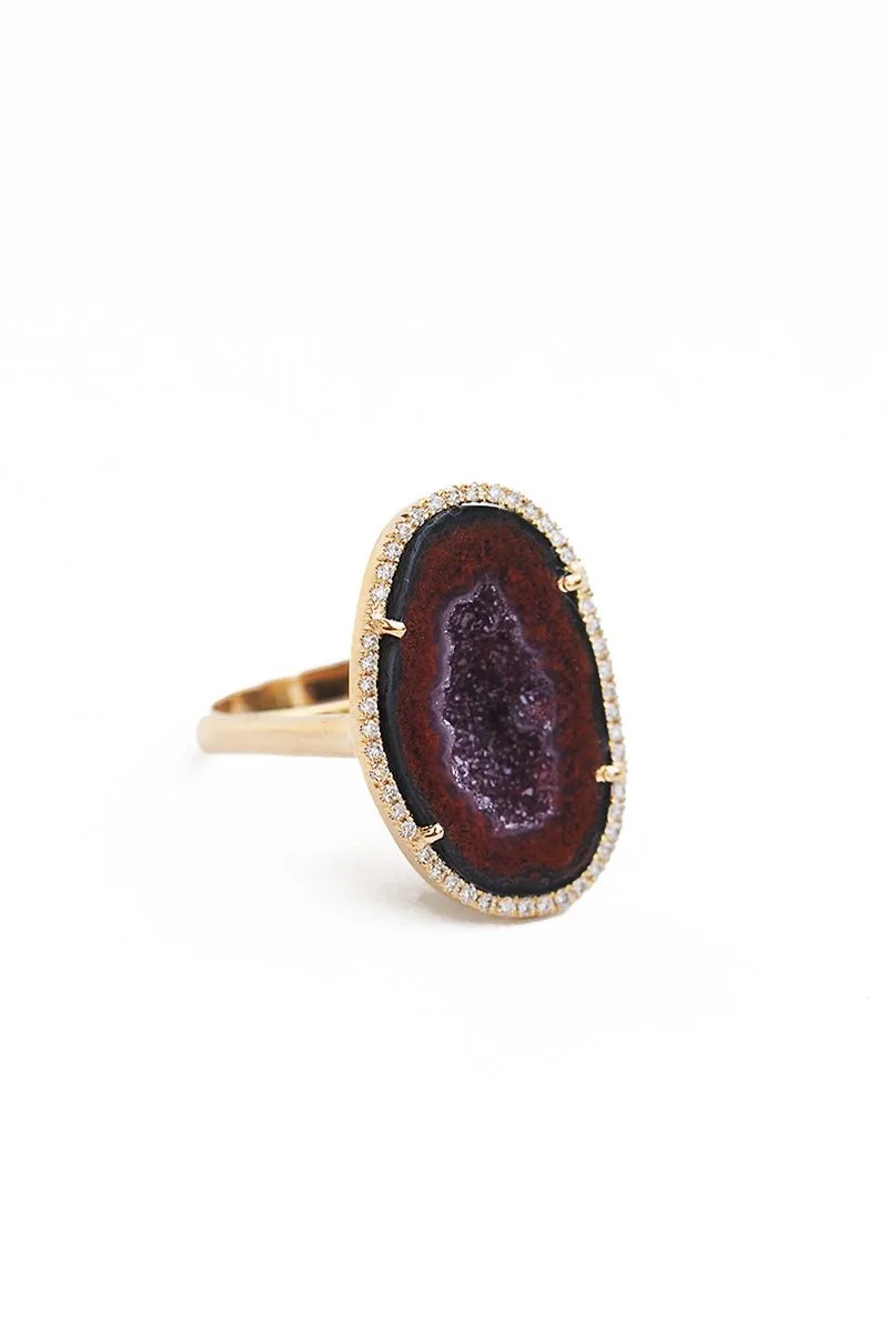 Rock the big question met Rocky, de signature ring van Karolin Van Loon. Kies voor een variant met een rode agaat geode en moedig hiermee onrechtstreeks je geliefde aan om haar dromen na te jagen, op basis van de kleurensymboliek achter de steen. Goed om te weten: elke agaat geode wordt door Karolin Van Loon persoonlijk geselecteerd tijdens haar jaarlijks bezoek aan Mexico, waar ze in nauw contact staat met een gespecialiseerd familiebedrijf. Het zetten van de diamanten rond de steen gebeurt in haar vast diamantatelier in Antwerpen.