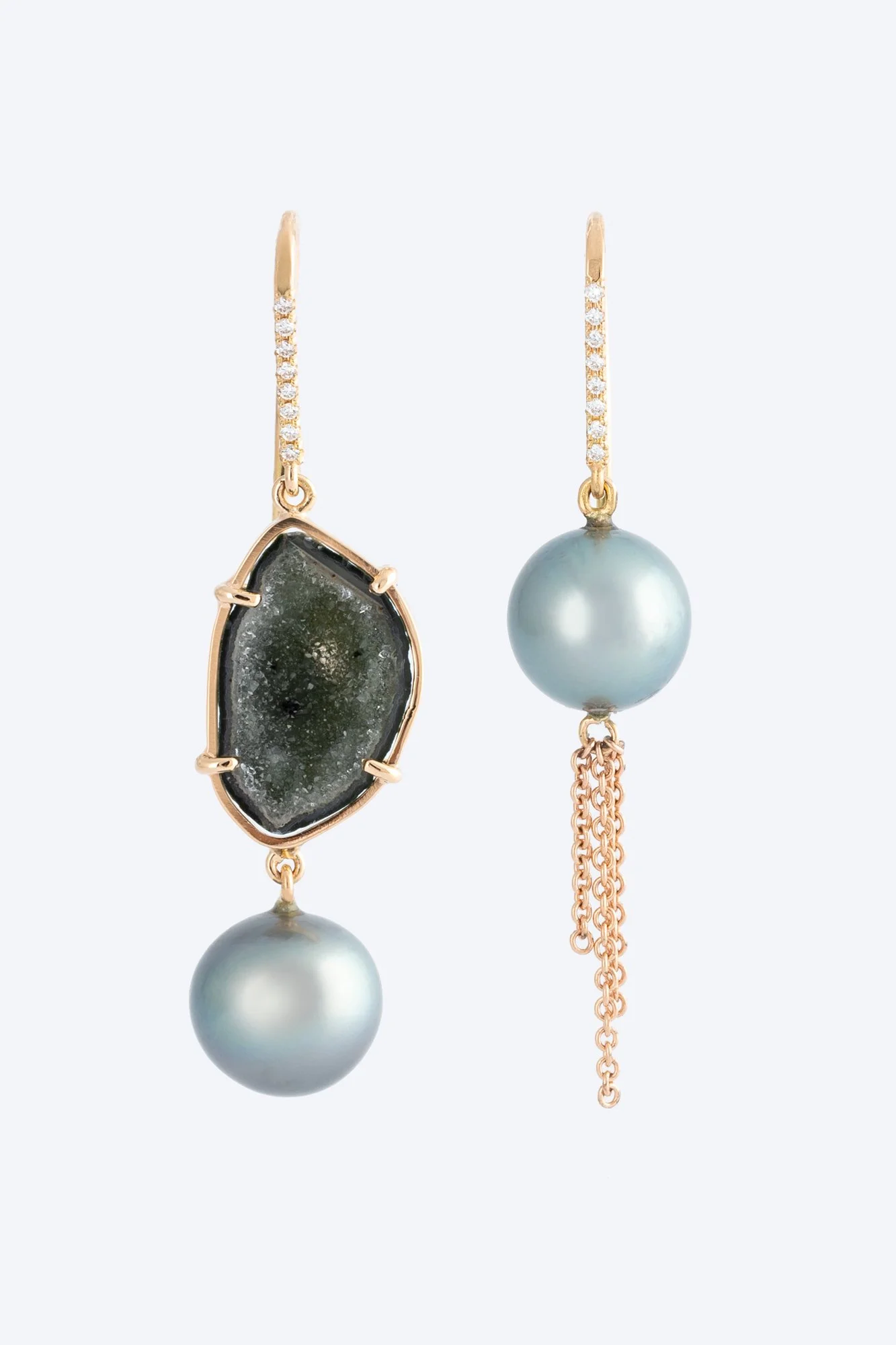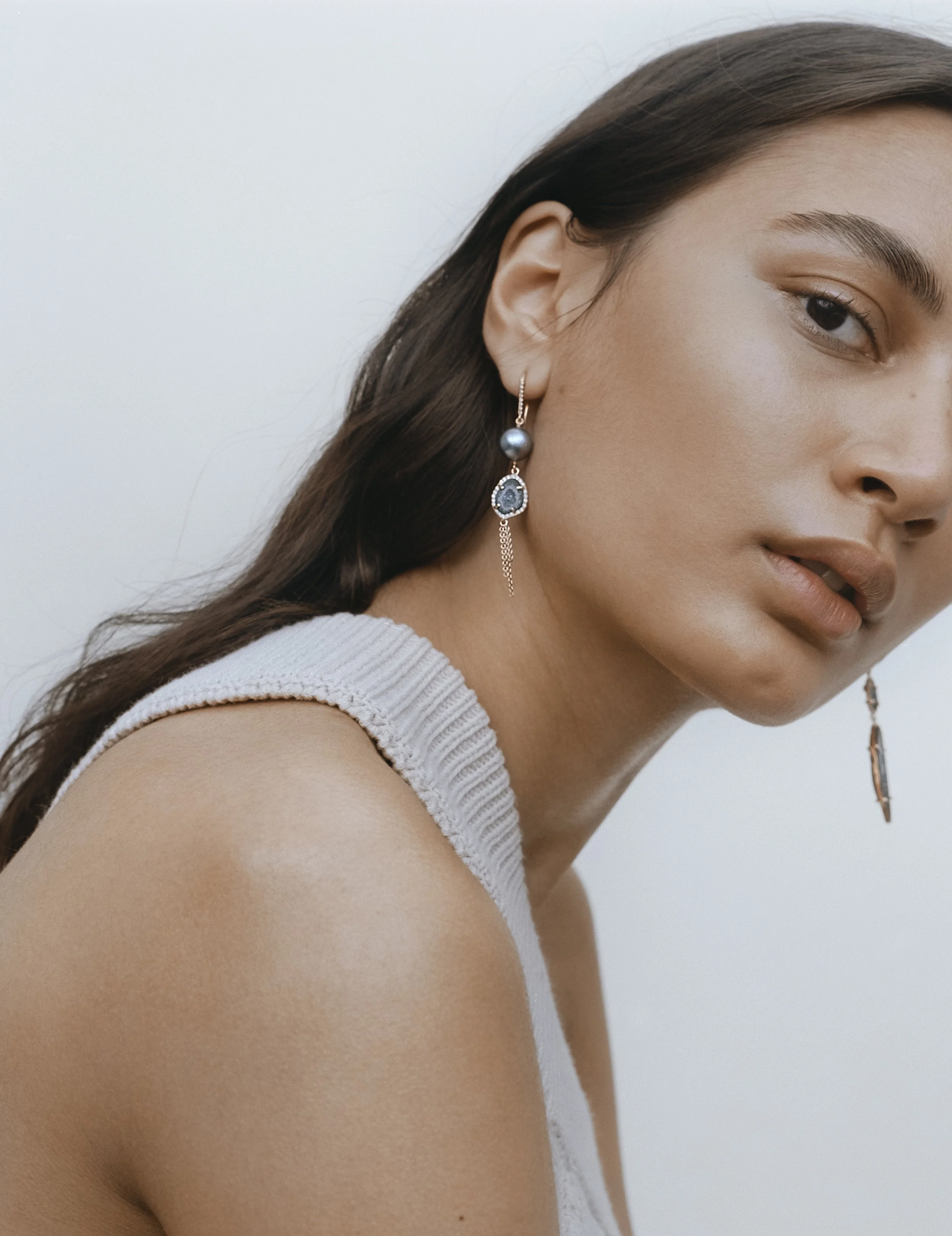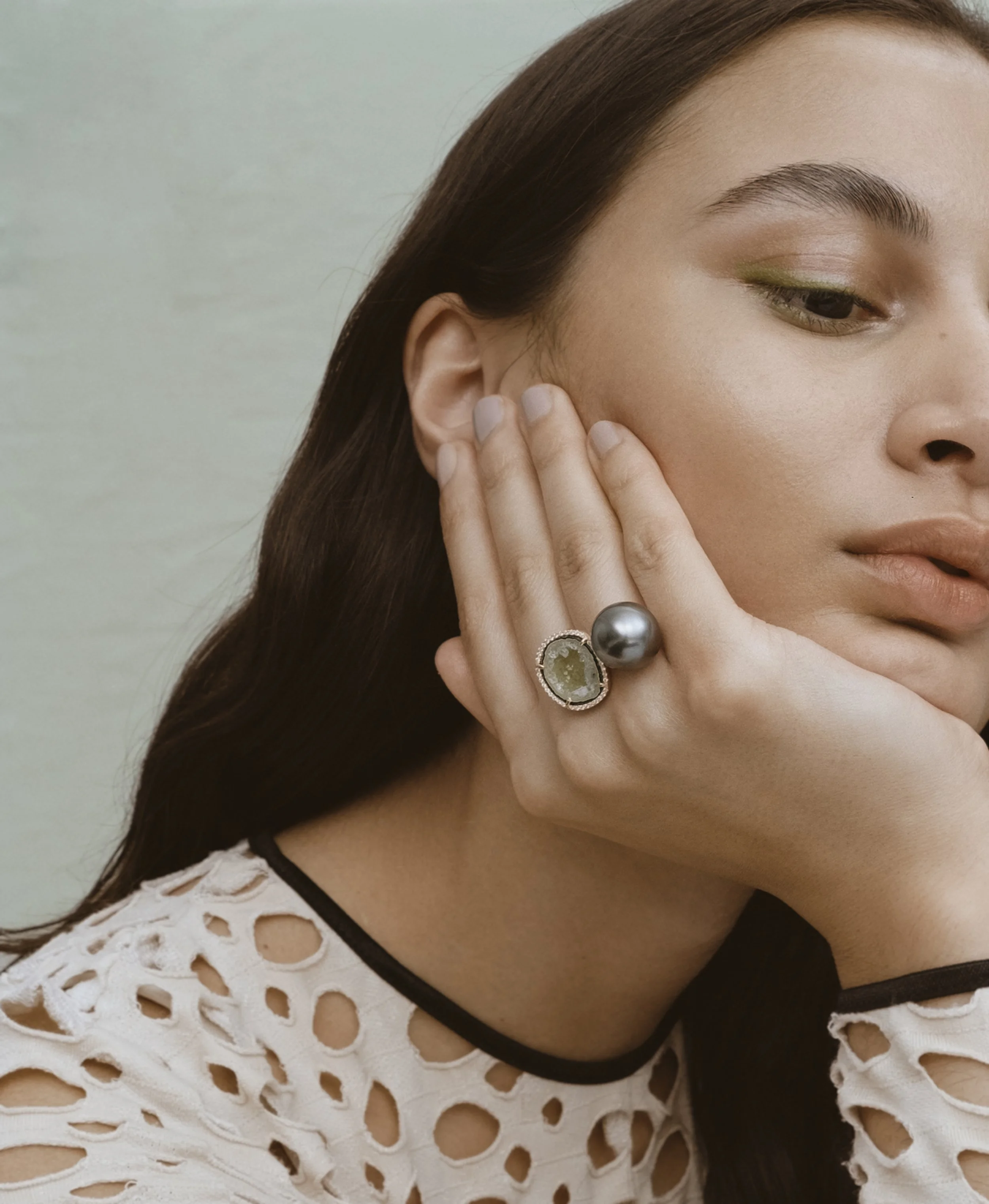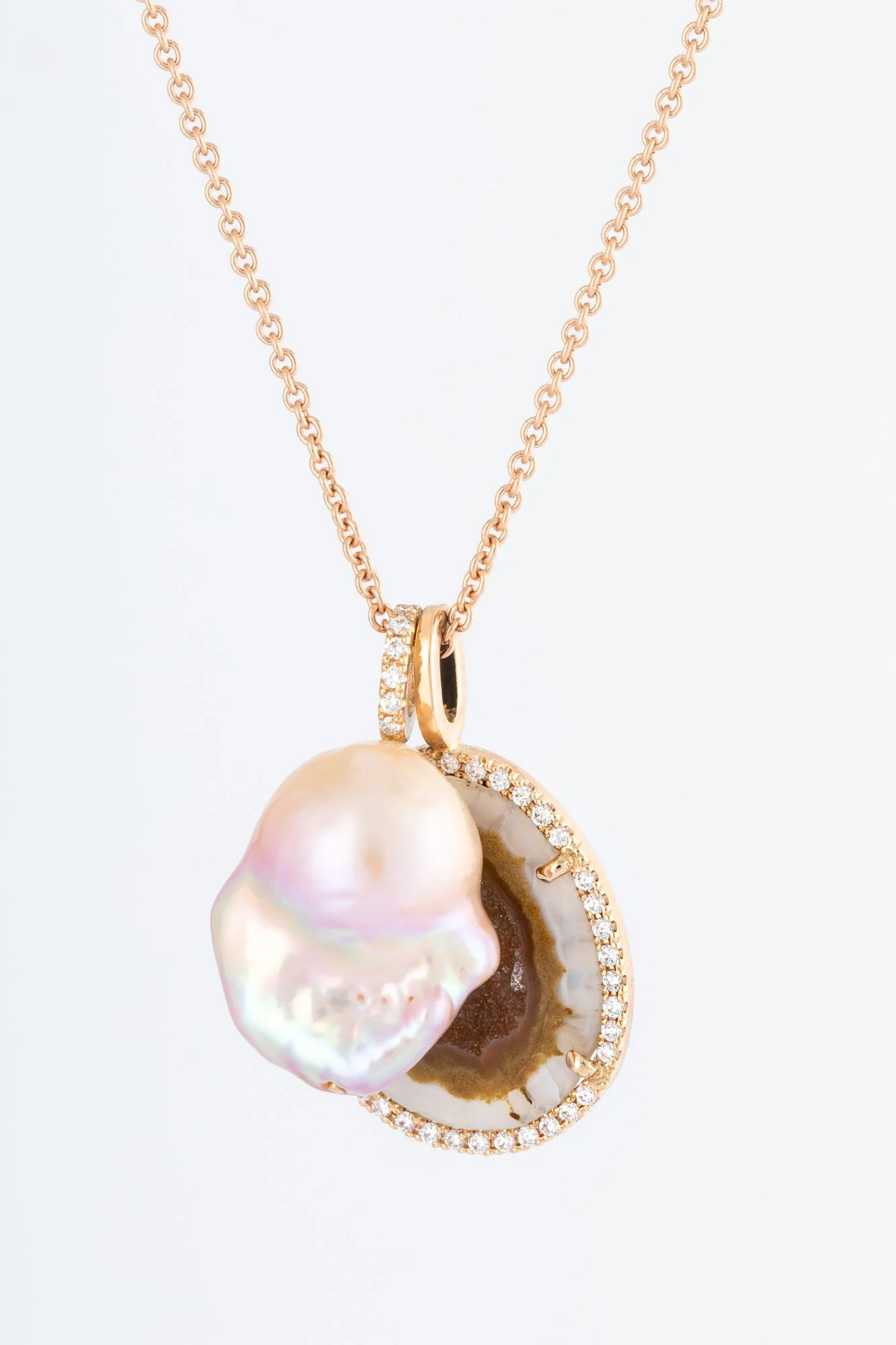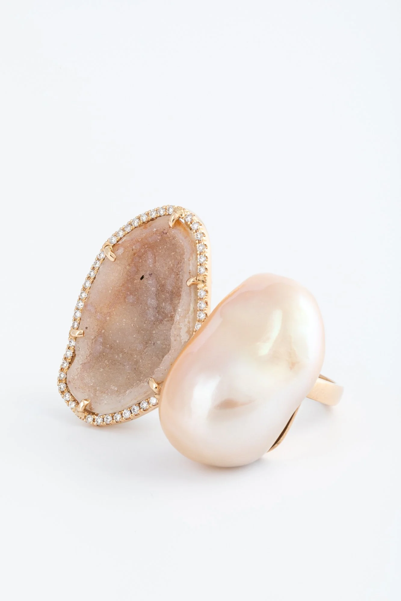 Om de ruwe schoonheid van de steen extra te benadrukken, omringt Karolin deze met kleine diamantjes. Het contrast tussen de diamanten en de agaat geode weerspiegelt voor haar de twee kanten in elke vrouw: zacht en vrouwelijk enerzijds, krachtig en charismatisch anderzijds.